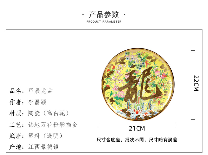 甲辰龍盤(pán)是錦地萬(wàn)花十二生肖系列粉彩瓷盤(pán)推出的收藏級(jí)瓷盤(pán),由首屆中國(guó)陶瓷設(shè)計(jì)藝術(shù)大師劉少平先生創(chuàng)意并監(jiān)制,由景德鎮(zhèn)陶瓷大學(xué)李磊穎教授執(zhí)筆創(chuàng)作設(shè)計(jì),甲辰龍盤(pán)以景德鎮(zhèn)傳統(tǒng)的粉彩錦地萬(wàn)花作地,以皇家色彩金黃色為基調(diào),萬(wàn)花圖案選取“海水江崖”、“福壽三多”“富貴牡丹”、“松竹梅”、“云邊如意”等紋飾,烘托出富有立體感的主體“龍”字,浮雕金龍字撫擷取自三希堂法貼中宋代蘇軾手書(shū)字體。紋飾和書(shū)法組合在一起,營(yíng)造出充盈的富貴感,寓意江山萬(wàn)代、山海福壽、幸福長(zhǎng)存等美好象征意義。