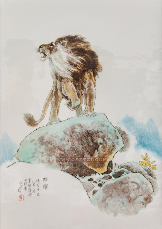 中國(guó)工藝美術(shù)大師李進(jìn)的瓷板畫《雄風(fēng)》,以一只傲立于山石之上的雄獅為主體,前足微收,鬃毛飛揚(yáng),目光如炬,展現(xiàn)出一種內(nèi)斂而磅礴的力量感。作品構(gòu)圖精妙,設(shè)色清雅,既延續(xù)了中國(guó)傳統(tǒng)繪畫的寫意精神,又融入了現(xiàn)代審美意識(shí),使雄獅這一經(jīng)典意象煥發(fā)出新的藝術(shù)生命力。