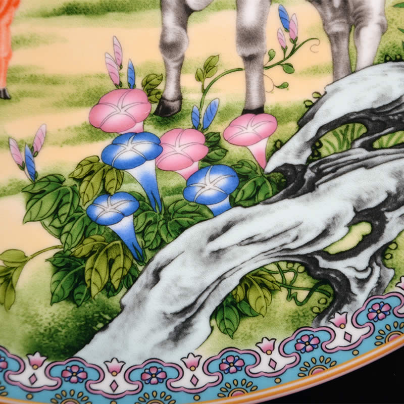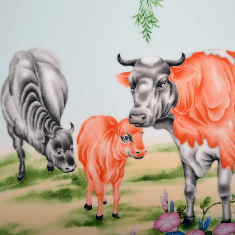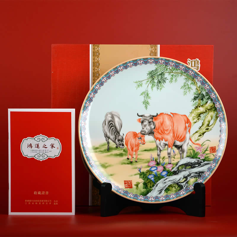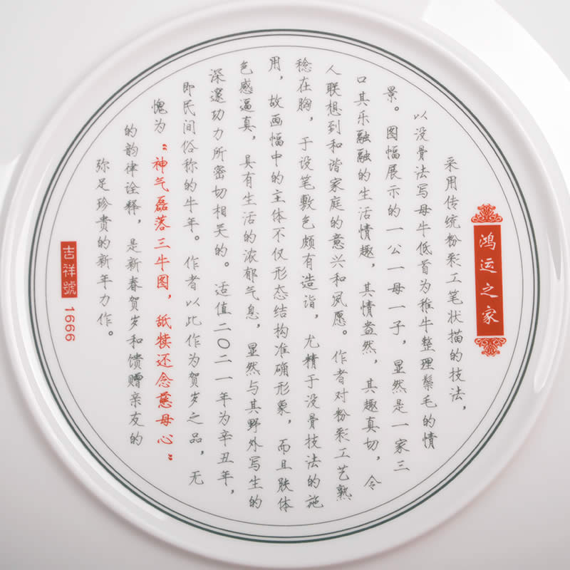 《鴻運(yùn)之家》瓷盤由中國陶瓷設(shè)計(jì)藝術(shù)大師劉少平先生和張俊良先生聯(lián)袂創(chuàng)作的生肖系列彩盤之一,生肖牛紀(jì)念瓷由江西省陶瓷研究所監(jiān)制限量生產(chǎn)。 《鴻運(yùn)之家》采用傳統(tǒng)粉彩工筆狀描的技法,以沒骨法寫母牛低首為稚牛整理鬃毛的情景。圖幅展示的犢牛一家,一公一母一子,顯然是一家三口其樂融融的生活情趣,其情盎然,其趣真切,令人聯(lián)想到和家庭的意興和夙愿。作者對粉彩工藝熟稔在胸,于設(shè)筆敷色頗有造詣,尤精于沒骨技法的施用,故畫幅中的主體不僅形態(tài)結(jié)構(gòu)準(zhǔn)確形象,而且膚體色感逼真,具有生活的濃郁氣息,顯然與其野外寫生的深邃功力所密切相關(guān)的。 時(shí)值二O二一年為辛丑年,即民間俗稱的牛年。作者以此作為之品無愧為“神氣磊落三牛圖,舐犢還念慈母心”的韻律詮釋,是新春賀歲和饋贈親友的彌足珍貴的新年力作。